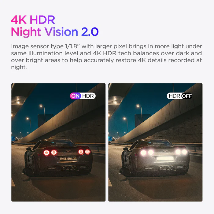 Chế độ nhìn ban đêm luôn là vấn đề nan giải của tất cả các camera hành trình, nhưng A139 Pro đã được tối ưu hóa cao. Cảm biến hình ảnh loại 1/1.8'' với điểm ảnh lớn hơn giúp thu được nhiều ánh sáng hơn trong cùng điều kiện ánh sáng, và công nghệ 4K HDR cân bằng giữa vùng tối và vùng sáng, giúp khôi phục chính xác các chi tiết 4K được ghi lại vào ban đêm.